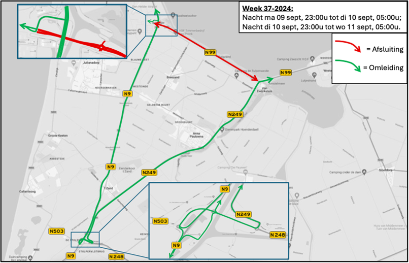 Mocht u op dit tijdstip gebruik willen maken van deze route, dan is de omleidingsroute in beide richtingen via de N9, N248 en N249.